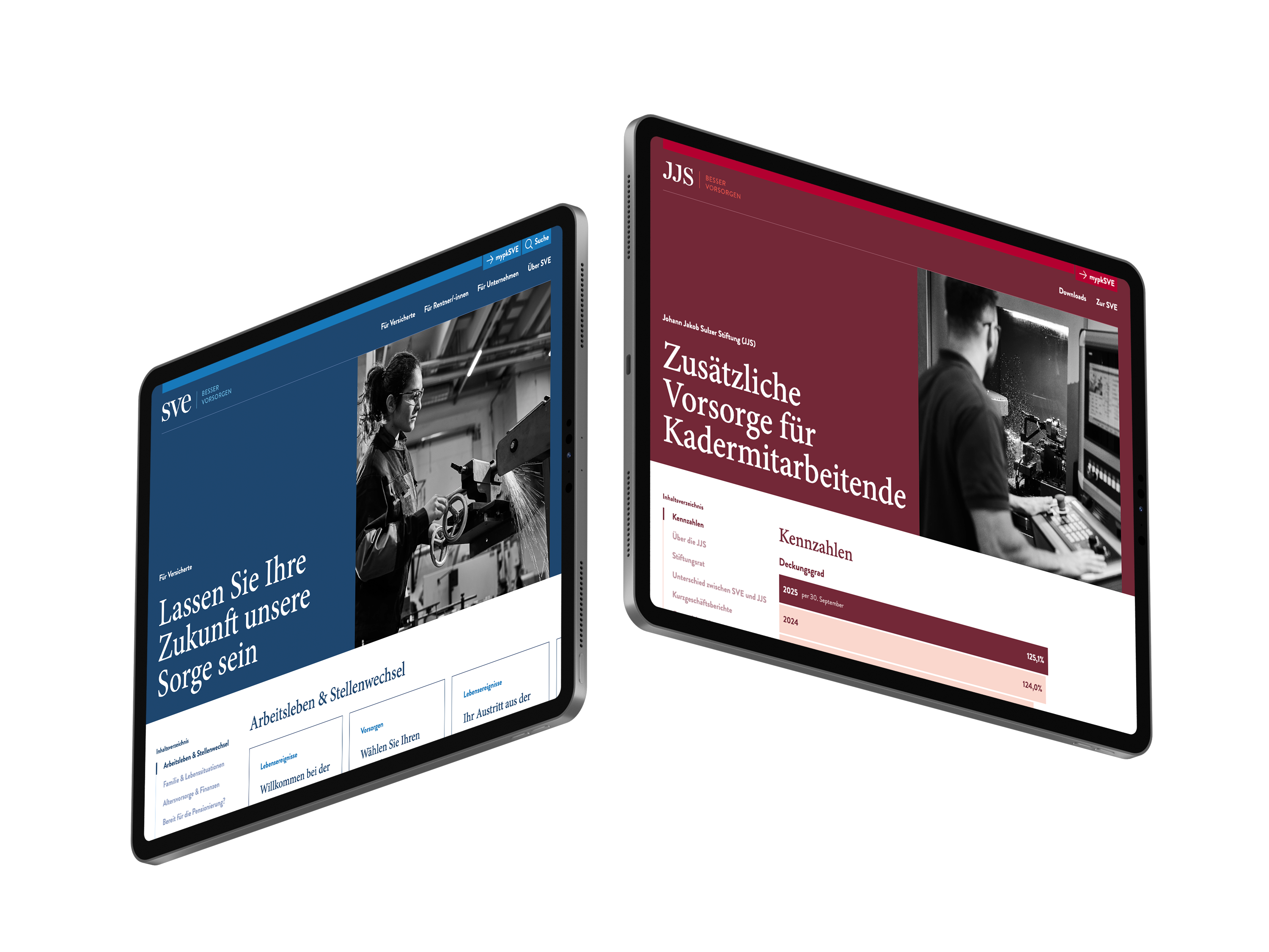 Als Pensionskasse spricht die Sulzer Vorsorgeeinrichtung (SVE) sehr unterschiedliche Zielgruppen an. Versicherte, Rentnerinnen und Rentner sowie Arbeitgeber und potenzielle Anschlussfirmen haben völlig verschiedene Erwartungen. Die Inhalte sind komplex und rechtlich sensibel. Die bestehende Website Landschaft war technisch fragmentiert. Besonders die separate Kader Website der Johann Jakob Sulzer Stiftung (JJS) war technisch veraltet und wurde wegen der Login Hürde kaum genutzt.